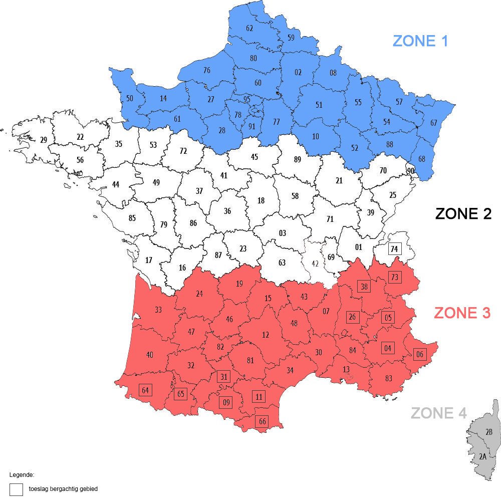 | Frankrijk - zone 3 | 89 € ZBTW | 1250 € ZBTW | 48 tot 96 uur | |
